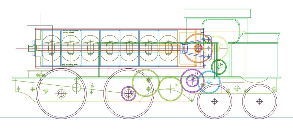 The Second Locomotive Go Back to the Contents Links I wanted to build a proper model locomotive, albeit still an experimental prototype, using the springs-in-series principle, but also wanted to cut down on the work not directed at developing this principle. I began to look in the G1MRA Journal for a kit of some kind that would be suitable, and made a couple of enquiries, before deciding on ARM1G as a host. I grew up on the Southern Region of BR, indeed have ridden on and fired an H class as a teenager, so that fitted nicely. An H class is not ideal for the project in hand for two reasons: first because the boiler is relatively small in diameter, and lots of boiler volume for springs seems desirable. And, second, because the distance from the boiler backhead - where the spring output shaft exits - to the rear driving axle is rather large. This distance necessitates a long geartrain, some gears of which are idlers. But, the advantage of the availability of commerical wheels and other parts was appealing. And so I laid out the General Arrangement of my clockwork version of ARM1G in the winter of 2011/2. This was followed by months of precisely nothing due to other pressures. The image below shows the general arrangement as it pertains to the present writing. What can be seen are seven springs; winder and ratchet/pawl at the smokebox end; a crown gear and pinion (http://www.zakgear.com/Scrown.html) at the cab end. The crown gear and pinion form the required right-angle drive, as well as providing ratio amplification. The output gear of the right angle drive is the beginning of a long chain of spur gears terminating at the rear coupled wheels axle. The reverser, governor, etc., are not shown.
