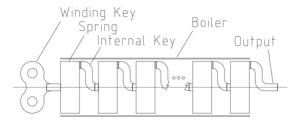 Imagine turning the first winding key with the output shaft fixed so that it cannot move. The inside of the first spring turns, and the torque is transmitted through the spring to its outside, and, via the internal key, to the second spring, thence to the third, and so on. Thus, as the first key is turned, the torque, and the contraction of the convolutions it causes, propagates down the springs; each spring taking up its share of the contraction. That is the basic idea. What it comes down to is connecting springs in series. In contrast, if all the insides of the springs were connected to a central shaft, and all the outsides were connected to an outer shell, then the springs would be connected in parallel. If N springs are connected in parallel, then the output torque is N times the torque of one spring, and the contraction of each of the N springs is the same as the contraction of one spring. If the springs are connected in series, the torque of the N springs is the same as the torque of one spring, and the contraction of each spring is one Nth of the overall contraction. Thus, connecting springs in series, in effect, produces a single long spring. There is a remaining issue, which is that the output shaft is perpendicular to the driving axles of the locomotive. So, a right-angle drive of some sort is required. |