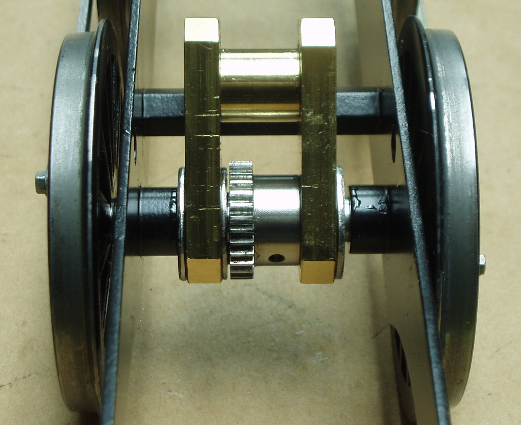 Chassis Go Back to the Contents Links There is not a lot to describe with regard to the chassis. The overall dimensions, wheelbase, etc., are, intentionally, identical to those for ARM1G. However, it turned out that the mainframe details are quite different because of the different requirements. Also, the stretchers were made differently, because it was easier for me, lacking a mill, to make stretchers using hexagon rod, and K&S tubing and washers, and turn the ends in a lathe. The important functional difference lies in the configuration of the driving axle, which has a gear and two supports to which the transmission is attached. The marks in the left support are a mystery; but we do have large mice around here.