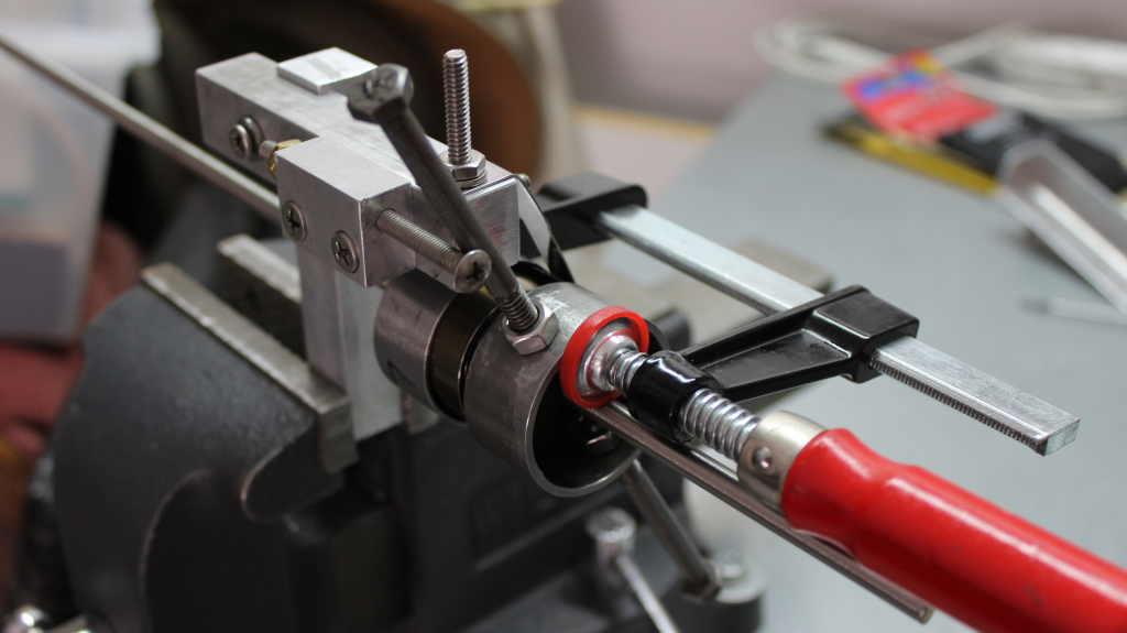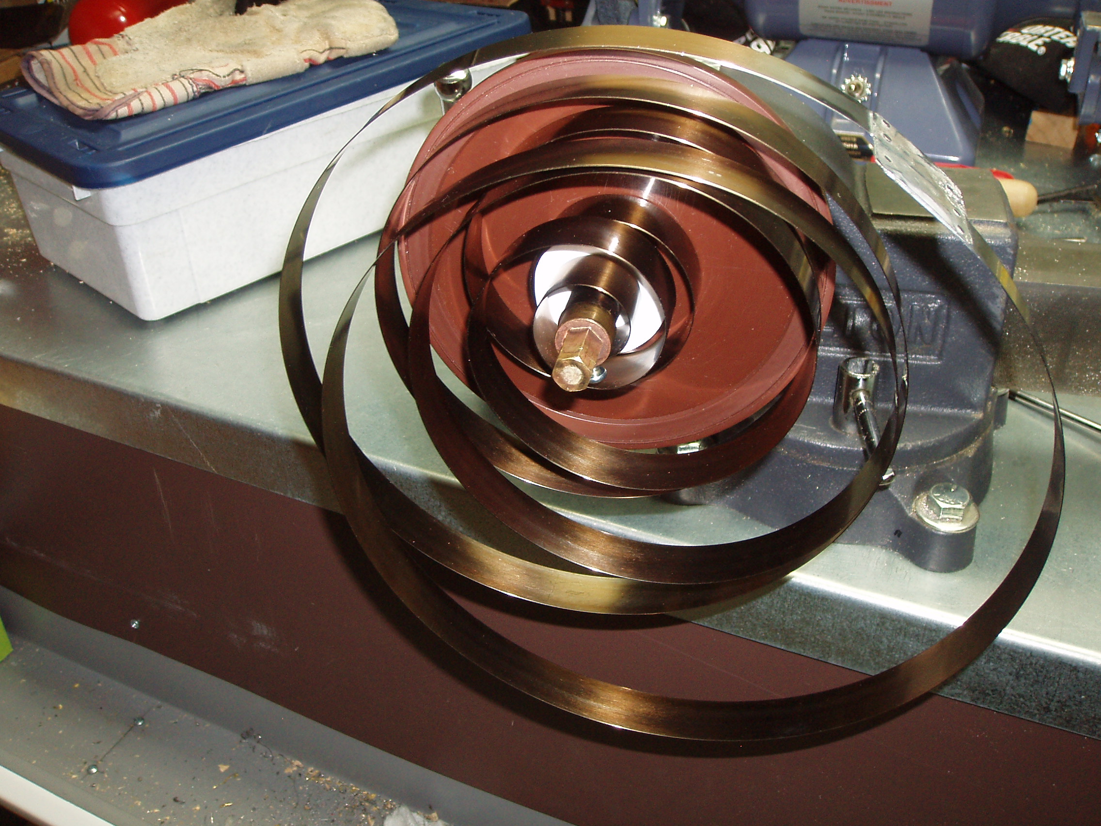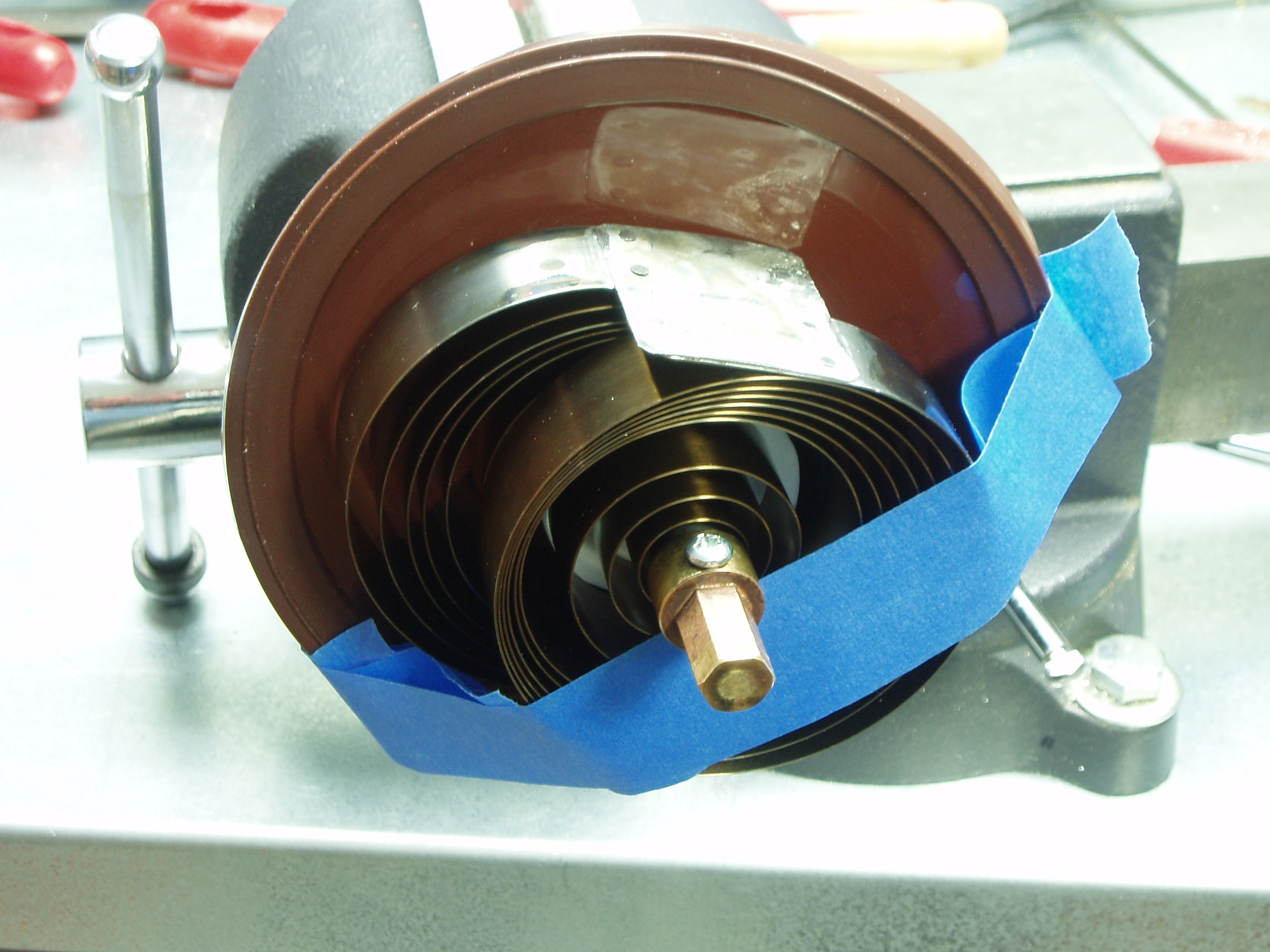 I made a spring winder. Like Topsy, it just growed, eventually being more complicated than originally intended. In these images the spring is wound sufficiently to be partially inserted into the bell; stopped by the winder-to-spring attachment [right image]. The red handled clamp is being used as a safety device which first enables the spring to be disconnected from the winder, and then assists in completing the loading of the spring into the bell. ![]() ![]() |