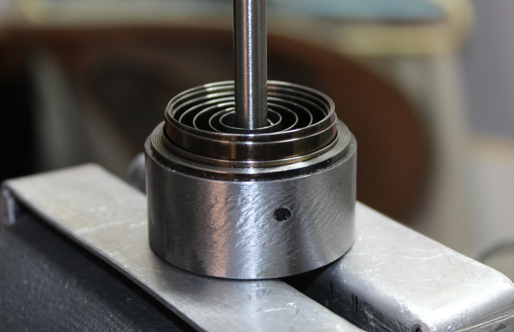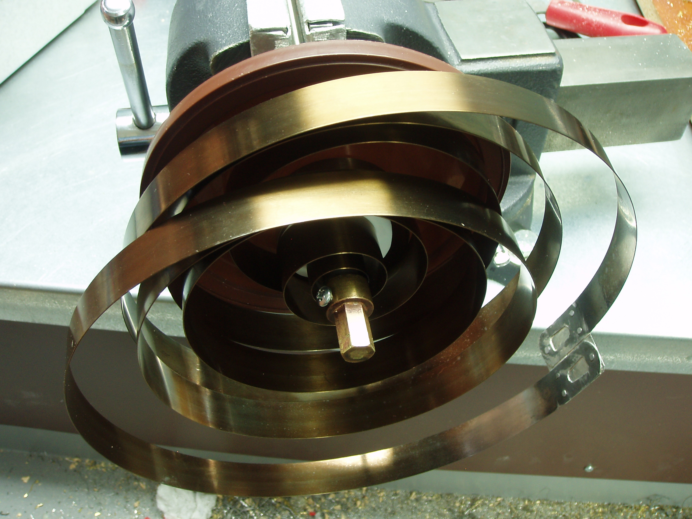 Sprend Repair Go Back to the Contents Links So, my inner soul was not able to leave the sprend in a broken state, and I did indeed repair it after the above 2018 photographs were taken; this repair work was started in April 2024. There were two tasks that needed to be addressed. One was the breakage in the sprend; this turned out to be a spring catch that came loose in one of the bells, probably a poor quality solder joint, but possibly the catch attachment being over-stressed, which would be a design fault, or maybe caused by over-winding. The second task was addressing spring winding adequate to install a spring in its Hermle-style bell. The latter task took most of the time; suffice to write that springs have minds of their own. The springs in this project do not have enough power to remove human body parts, such as fingers, but rapid unwinding surprises, even nasty cuts or an eyefull, are a possibility. I wear a facemask when winding a spring. |