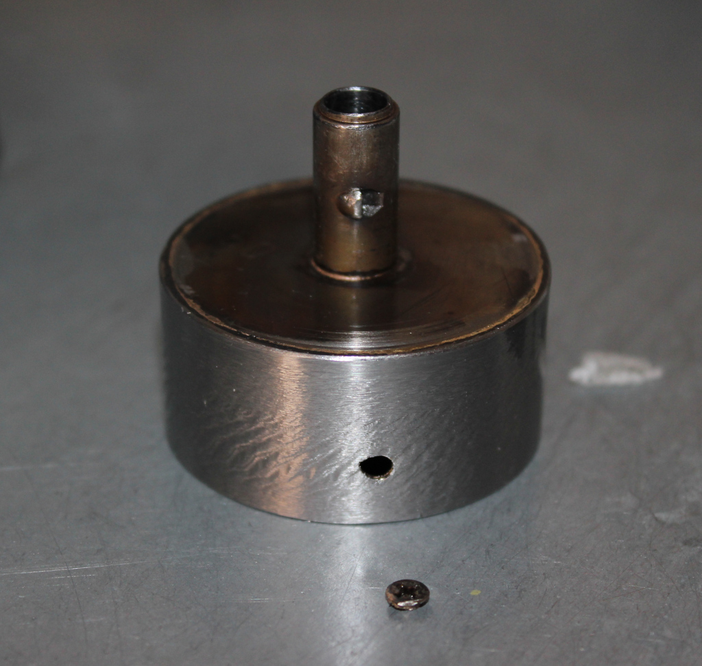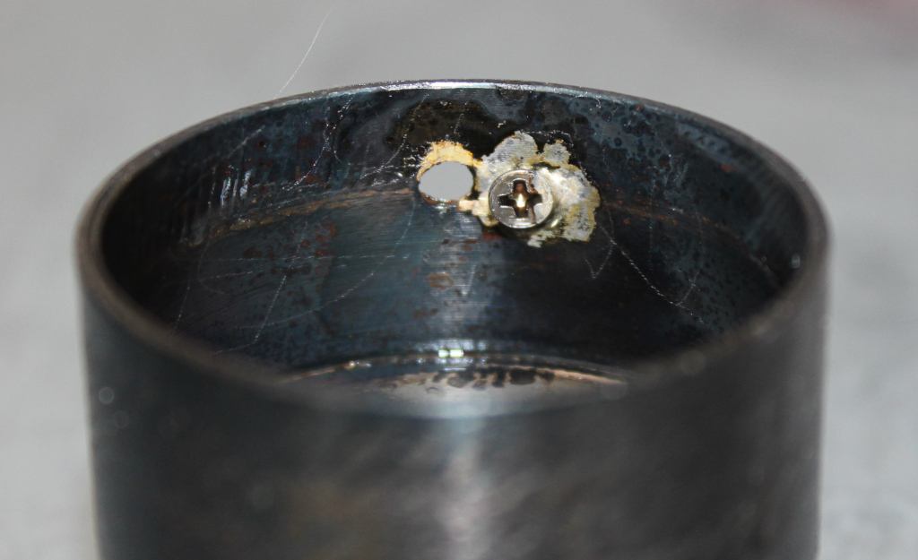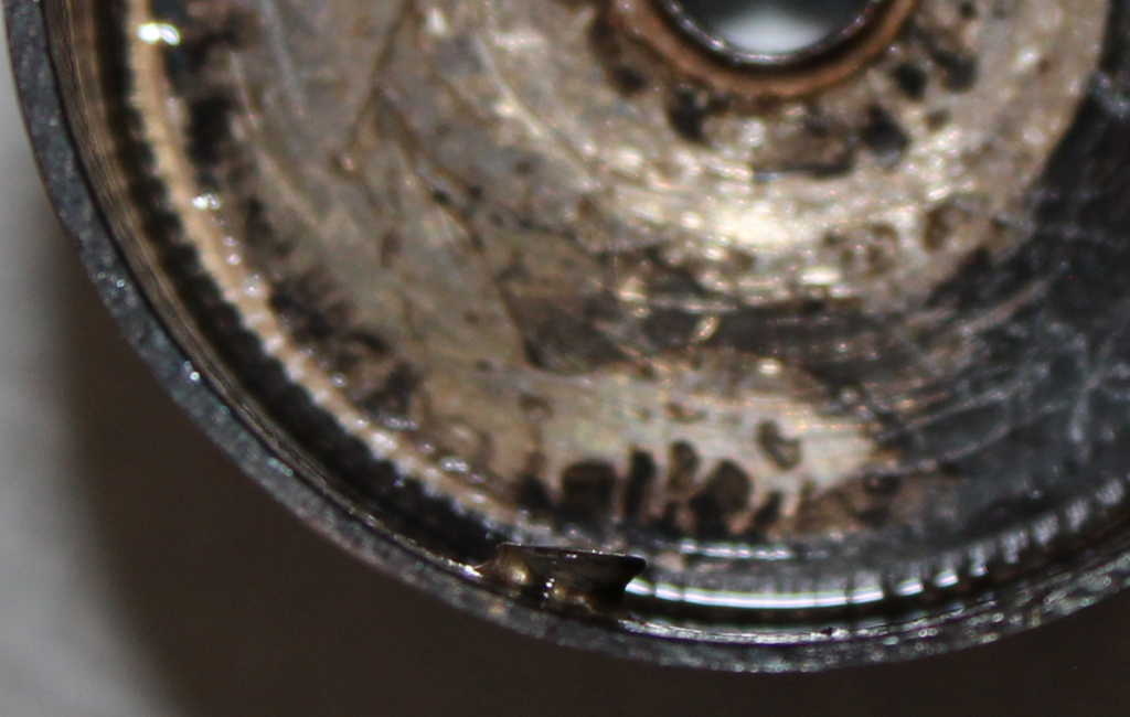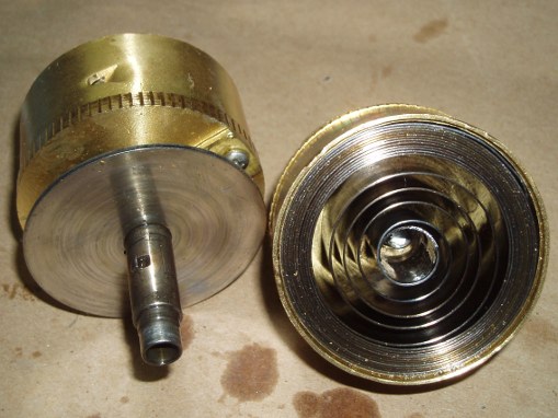 These images show the damage. On the left the spring is about to be removed from the bell, and the hole is where the catch has been ripped out. The catch is still inside the bell. On the right the bell is empty, the recovered catch in front. ![]() ![]() |