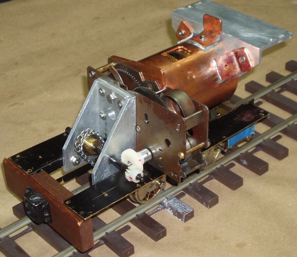 The First Locomotive Go Back to the Contents Links The Spring WindUp was a few weeks away, so I built a proof-of-principle engine from the usual collection of bits-that-I-had. The springs were purchased from a clock parts supplier who happens to live a few miles from me. By good fortune, there is a type of spring that is supplied within a casing (Hermle), and this made it fairly easy to lash-up a prototype using two springs in series. It did not work. In my haste, I had omitted the outer shell (pseudo-boiler)! I know, I know, but these things happen. Of course, in the design being considered, this outer shell has the important function that it has, so the reader can imagine the result of its omission. A year later I dragged out the experimental prototype and remedied the omission. Also I lowered the overall gear ratio, which I was fairly sure I had set too high - recall that I was after distance performance. This time the engine worked, and after a little bending and sloshing oil everywhere, and despite out-of-true and other generally nasty friction generators, performance was there, and the principle was established. This locomotive would run for about 400 feet on one winding, but would not pull anything much. You can see this locomotive run at the Spring Windup 2011. The images below are of this first prototype. The key spindle and tension-retaining ratchet are on the front; the spring casings can be seen through the holes in the pseudo-boiler casing; the primary ratio-amplifying gearbox is a Marx mechanism that is in pretty bad shape; the secondary amplification cum right-angle drive is clearly seen, these are parts from a photographic slide projector; the chassis is from a steam engine that is waiting its turn for refurbishment. A construction detail is that the drive train is reversed from the description above, i.e., the winding key plugs into the outside of the spring, and the inter-spring internal key connection is from the inside to the outside.