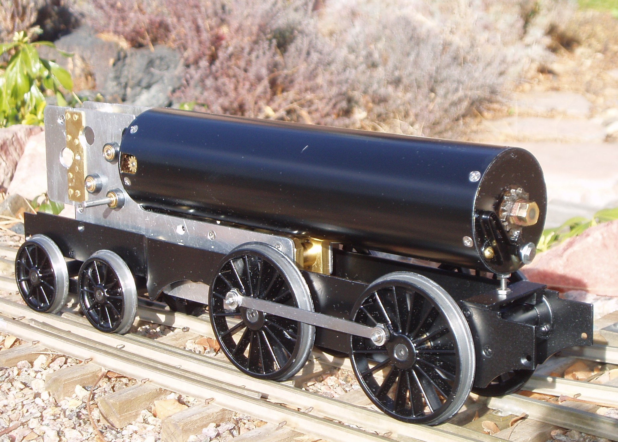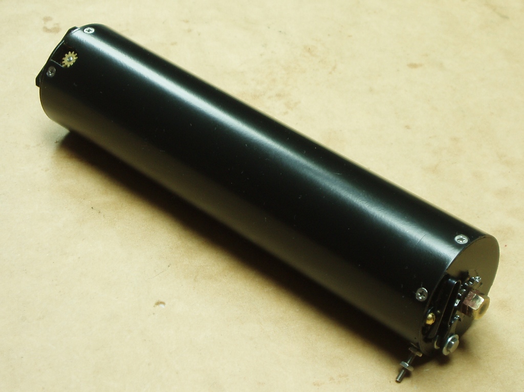 Making It Go Back to the Contents Links There are four main assemblies that make up the second prototype locomotive: the locomotive chassis, which is where ARM1G comes in; the pseudo-boiler containing springs; the transmission, including gear ratio amplification, governer, and reverser; and the H class superstructure and other cosmetics, which makes the machine look like a steam engine built one hundred years ago. Only the first three assemblies are necessary to make a functioning locomotive, and these are described below. The cosmetic work will follow in due course; but it is deemed not to have the same interest value as those of the other assemblies. |