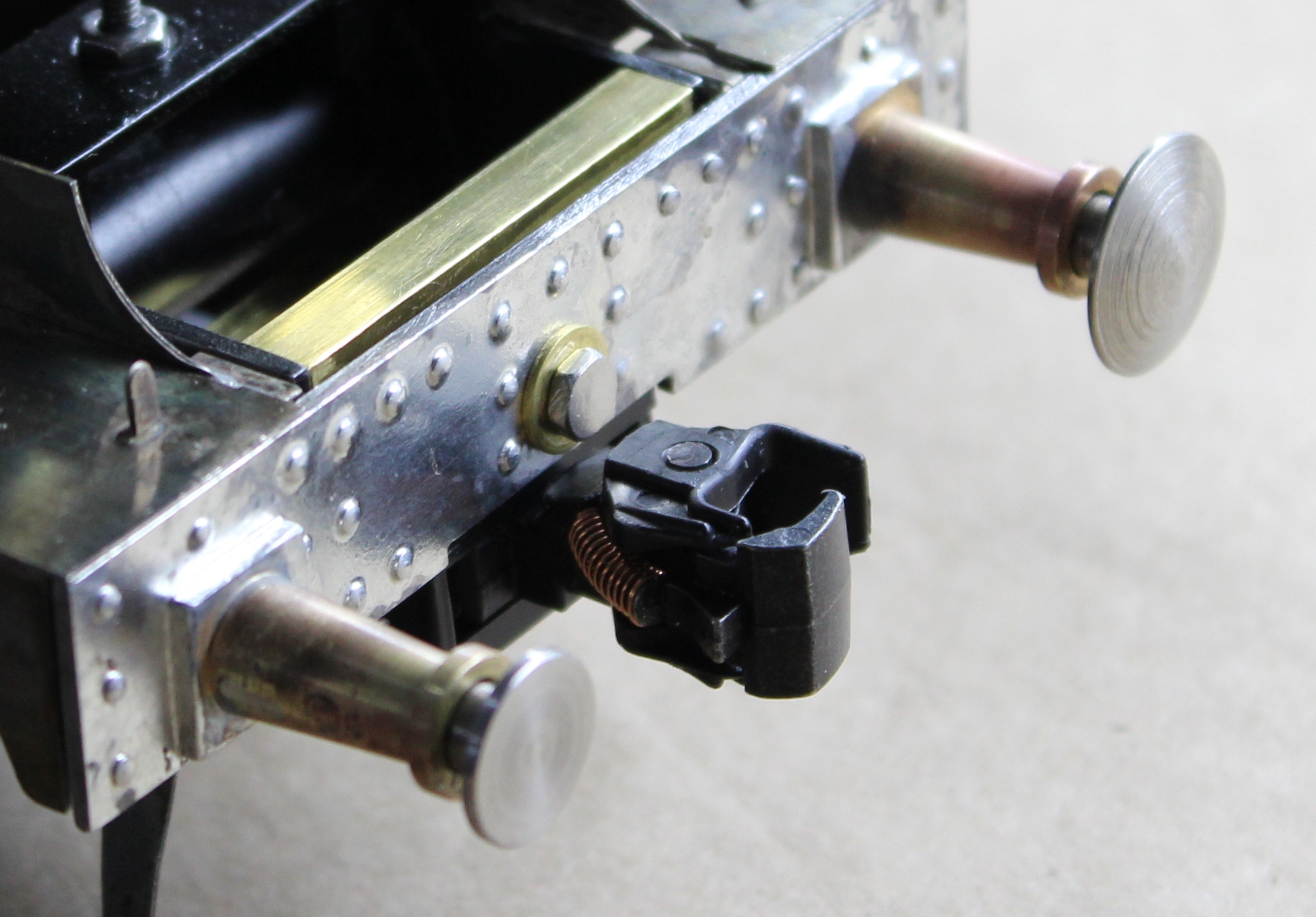 Locomotive Go Back to the Contents Links Repair to the locomotive was limited to re-soldering the ratchet wheel; replacing the first spring in the sprend, which had indeed started to tear; and re-working the pawl engagement springing. New work was fitting the three shoulder bolts which serve as the locomotive side of the torque transmitting bayonet connector. It was necessary to re-work the pawl engagement springing in order to allow clearance for the winder side of the bayonet connector. This was a little difficult because of the lack of room and the realities of a retro-fit. The result seems to be acceptable as part of a prototype, and installation is not expected to be difficult on a future design. |