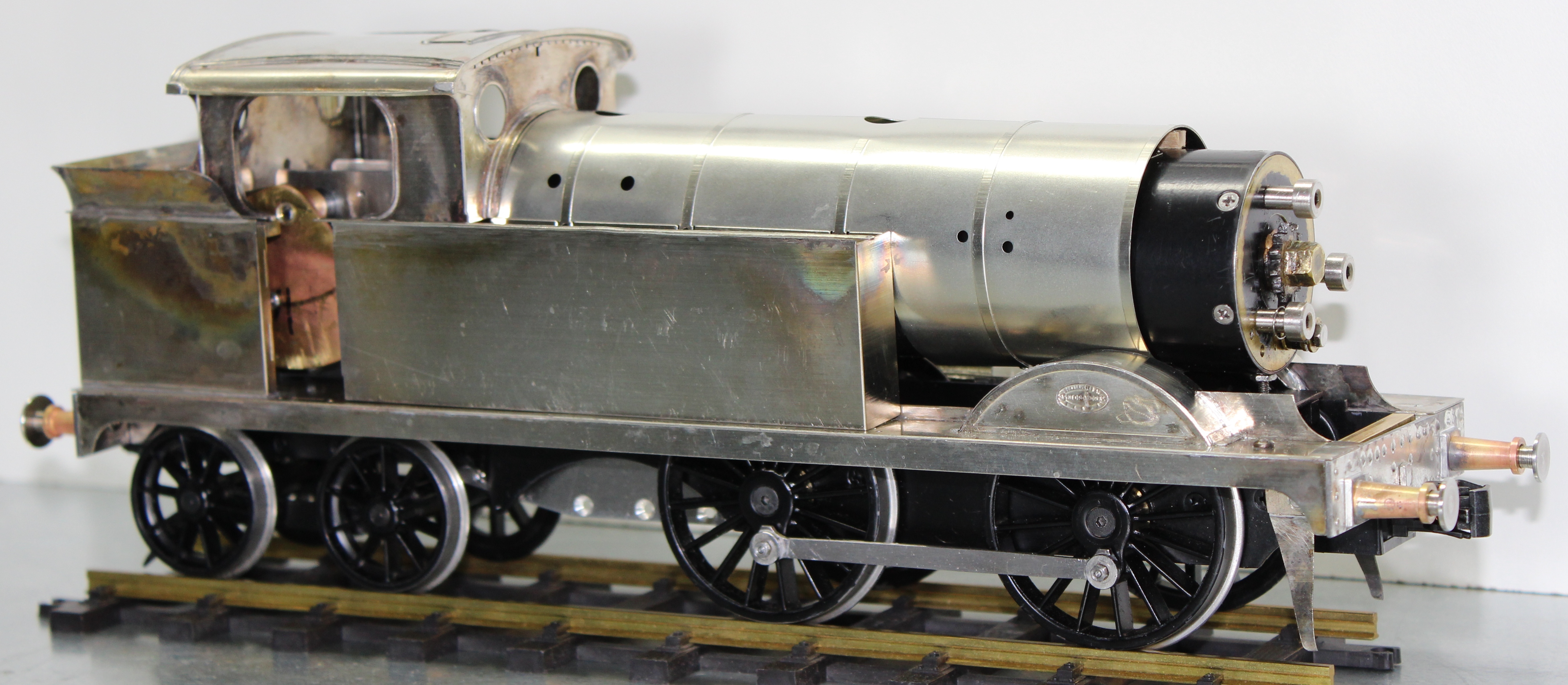 Another Restart Go Back to the Contents Links I am writing in May 2024, about fourteen years since this project was started. Interruptions include building a portable railway. I intend writing as though this project is continuous and unaffected by the time delays; but I expect there will be discontinuities for the reader. Cosmetic work has been accomplished from time to time, finished by 2018; and the images below show the results. I have never painted lining before, as can be seen from the result. Also, the sprend is broken, which troubles me; I do not like to leave the locomotive in a disabled condition, even though I do not plan to run it very much. |