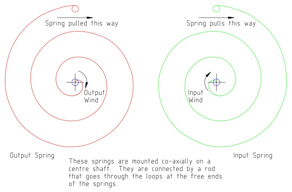 The springs are arranged in pairs; these springs are arranged to coil in opposite directions. By connecting the springs at the outer ends, winding to tighten the coils of the first spring also tightens the coils of the second spring. One pair is one spring cycle, and the cycle is repeated as many times as desired. Input and output are at the inner ends of the spring-pair, which enables simple coupling between pairs. There is a practical consideration caused by the axial relative displacement, which causes a transverse twist where the springs are connected. Probably this twist will need to be resisted by a bearing on the central shaft, rather than the conceptual rod-and-loop connection shown in the sketch. A balancing, second kind of, pairing is not obvious. |