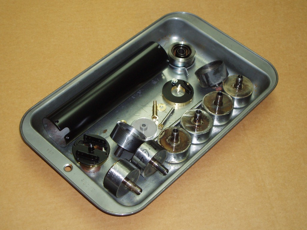 The Spring Loaded Boiler Go Back to the Contents Links A pseudo-boiler loaded with springs is an energy storage, but not an energy generating, device. So, for brevity's sake, and until a better name emerges, the pseudo-boiler will be known as a Spring Energy Device, or Sprend, or possibly Sprendev. The General Arrangement image above shows the layout of the sprendev. The image below shows a tray containing all the parts for the sprend prior to assembly. Starting from the black outer shell, and working around clockwise, are seen a spring, as purchased; an empty bell for that spring, this is the bell that has the winder ratchet built into it; a row of six spring bells, already loaded with springs; ending with the housing for the ratio amplifying, right-angle drive, that is the power supply end of the sprend. Continuing up the middle of the tray, are seen the crown, final drive, and pinion, gears that are mounted in the housing with the journal bolt. The remaining items are a shim washer for the right-angle drive; the winder support with its large diameter bearing that clears the ratchet periphery, and the associated pawl and its spring; and, next to the springs, the long central shaft that supports and locates the spring bells. The clearance slot in the end of the outer shell is to miss the pinion. This slot has no other function; it became necessary because of the sizes of the tubes that I obtained to make the outer shell and the spring bells. In an ideal world this slot would not exist.