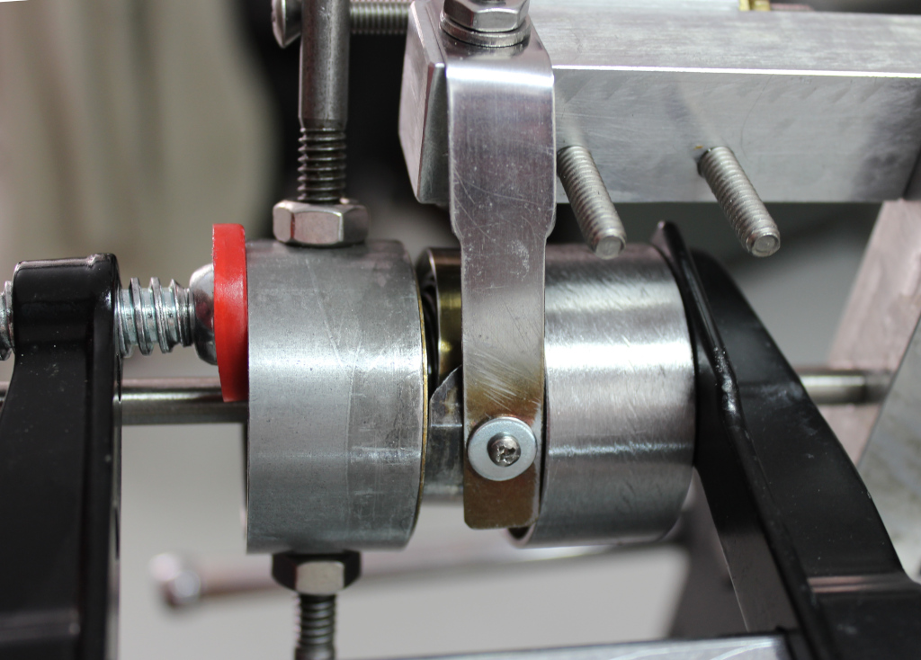 The sprend looks quite innocuous and boring once assembled. However, it is heavy since it is full of steel; and it does store quite a lot of energy. This image shows the wind end of the sprend, including an adjustable pin that bears on the chassis support shown earlier.