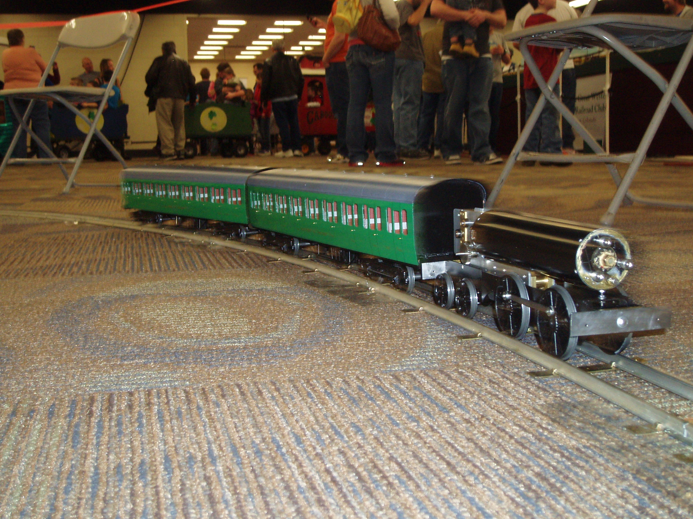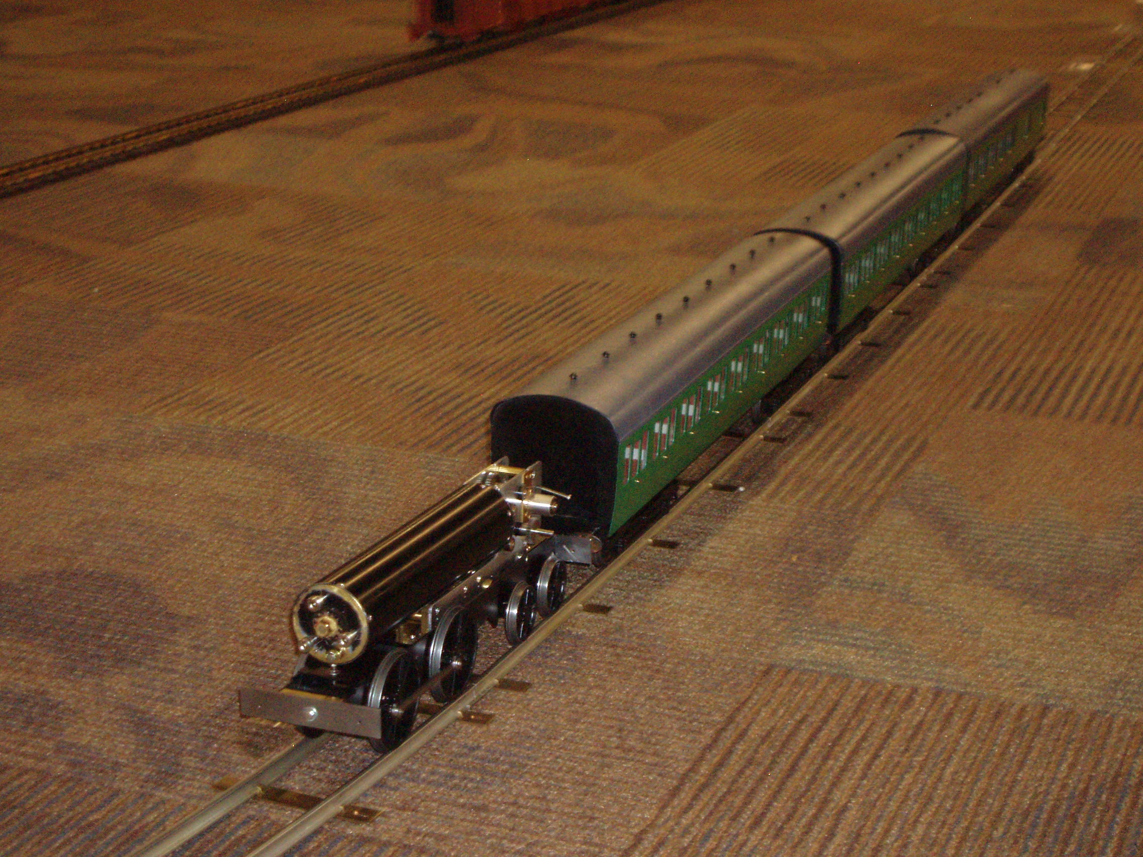 54 sprend turns for a 7 spring sprend is just shy of 8 turns per spring. This contradicts the earlier guesstimate of over 60 turns, i.e., about 9 turns per spring. And this, in turn, makes the target locomotive performance of a quarter of a mile look to be out of reach. At the train-show there was an improvement in performance as time wore on, suggesting that something was settling-in. I speculate that this is not surfaces smoothing out, as might be a first guess, but rather movement of the gearbox frames and the self-aligning bronze bearings. It has been demonstrated that the mechanism can bind somewhat with finger pressure on a side. Whatever the cause of the loosening-up, it is becoming a problem because the governor is so ineffective; excessive speed at the beginning of a run being the result. It will be necessary at some point to re-site the governor in order to run it at a higher speed. At present the governor runs too slowly for its centrifugal force to change sufficiently with locomotive speed. Here is the locomotive running at the train-show.