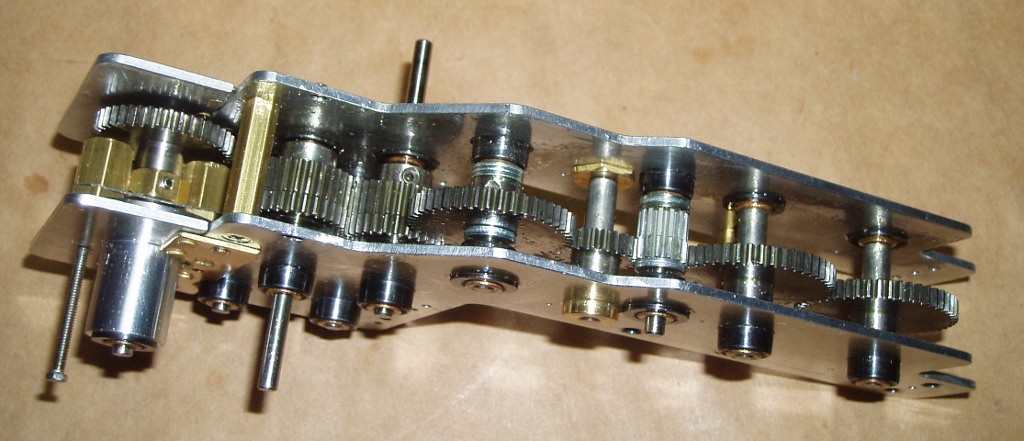 Transmission Go Back to the Contents Links The basic shape of the transmission is very ordinary; the image below is a view looking up from the bottom. The axle connection is on the right; the governor is on the left; the wide two-piece gears on long shafts are the sliding mesh reverser; the other gears are idlers, all necessary for the reason given in The Second Locomotive; the connection to the sprend is hidden behind the reverser gears. The sprend crown gear has 76 teeth and meshes internally with a pinion with 11 teeth; this 11 teeth gear is on a common shaft with the 64 teeth sprend output; which meshes with a 24 teeth gearbox input on a common shaft with a 48 teeth gear. After a string of idlers the final mesh is with a 29 teeth axle gear. Thus the overall amplifying gear ratio is 76/11 * 64/24 * 48/29 = 30.5