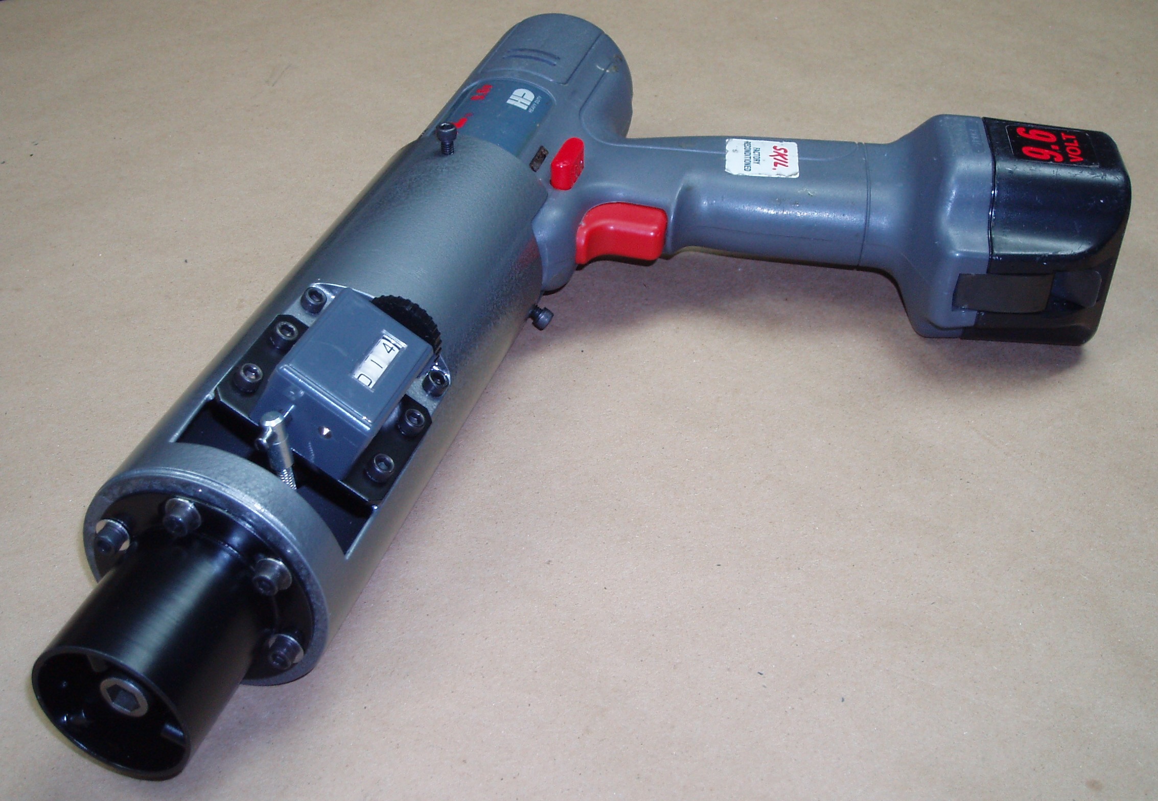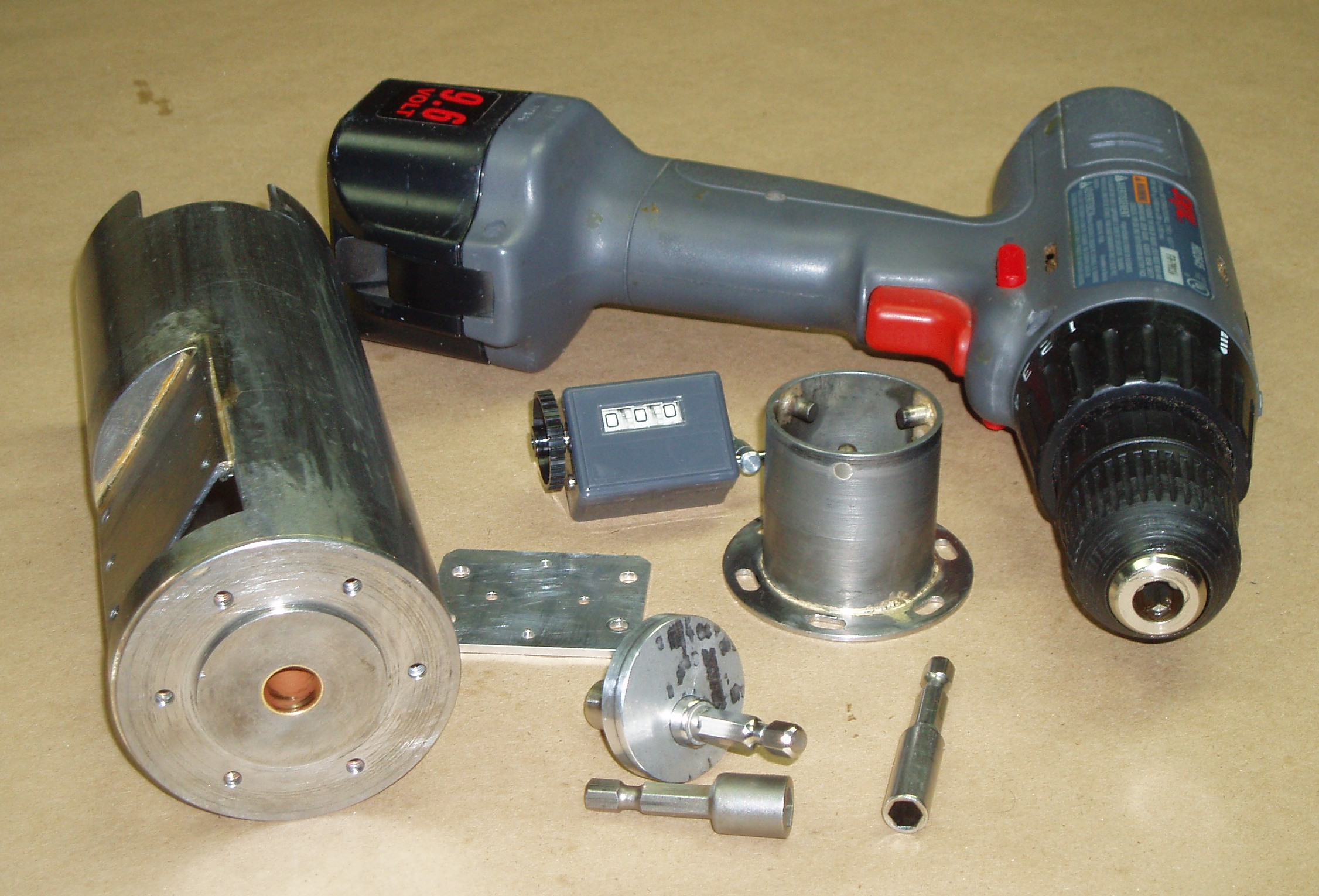 Force Circuit Winder Go Back to the Contents Links Since it was the cause of the breakage, the problem with power winding described in A Forced Stop has been addressed and a newly designed winder has been made. This is referred to as a Force Circuit Winder (FCW) because opposition of the electrically generated opposing torques at the chuck and the power drill casing is resolved by a casing extension that connects to the locomotive. Thus the basic physics requirement of a force circuit is met by replacing the human muscle and bones connection, normal when using a power drill, by a metal tube and fasteners. The unwieldy characteristics of the original system thus disappear completely from the human's point of view, including the need to hold onto the locomotive. The further important feature of the Force Circuit Winder is the incorporation of a revolution, or turn, counter. Thus, setting any specific wind, in particular limiting the maximum wind, can be accurately controlled as a number of turns instead of relying on the power drill torque-limiter. The first image below shows the winder parts, complete but unpainted. The three shafts are commercial items as used in the construction trade and elsewhere. One of these shafts has been fitted with an eccentric. This shaft runs in the bearing in the end of the main casing, and the eccentric drives the turn counter. The second image shows the painted and assembled winder; and the third image shows the three pin bayonet connector system used to transmit torque between the locomotive and the main winder casing.