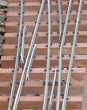 3. Junctions, on the basement floor, and installed (after a few years, the ties and the rails have weathered). The, short, piece of track between the points at the top of the image on the right connects the two reversing loops. The detail images below show two significant differences in two junctions on the railway. The left image shows the use of spikes for rail attachment, the right shows the use of screws. My experience is that screws are considerably better than spikes because screws do not work out of the ties as do spikes. I note that screws are used on 7-1/2 inch gauge track; I suspect for a similar reason. Since these images were photographed I have concluded that staggering the screws (or spikes) along the rail is generally a bad idea. I have had no problem with splitting the wood of the ties. But I have had problems with ties mis-aligning by twisting due to staggered fasteners. This has been particularly true with dual gauge track, which has three rails and consequent twisting torque inbalance applied to the ties.