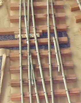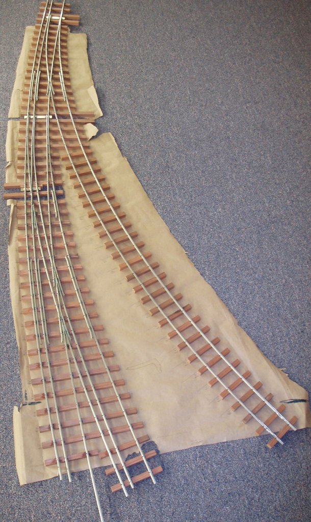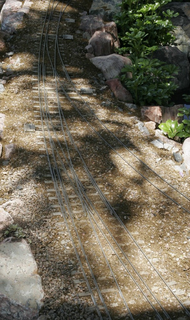 Track Go Back to the Top The rail is all Llagas Creek nickel-silver. The solely gauge 1 track is Llagas Creek flextrack with code 215 rail. The rest, gauge 3 and dual G1/G3, is home made using code 250 rail. The ties (sleepers) all came from the wood from a house deck that was re-built; the old wood was bashed up, had some dry-rot around nail holes, and was no use for house building; but, armed with a table saw, you can get a lot of ties from an old redwood 2x4. Track was made in the house. First, by drawing what was required on craft paper. Then, ties were fixed to the craft paper with water-soluble glue (Elmers); followed by rail attachment and all other building tasks. On installation the craft paper was torn off; and any paper remnants and the glue disappeared with the first rainfall. The drawing step, which allows for erasing and re-drawing, allowed experiments and ultimate accuracy.