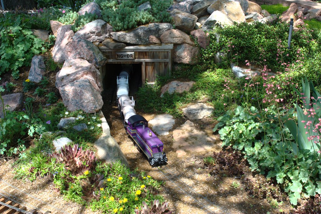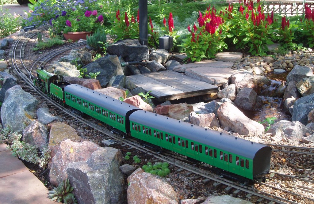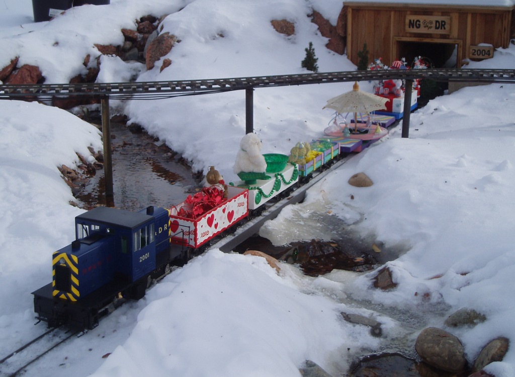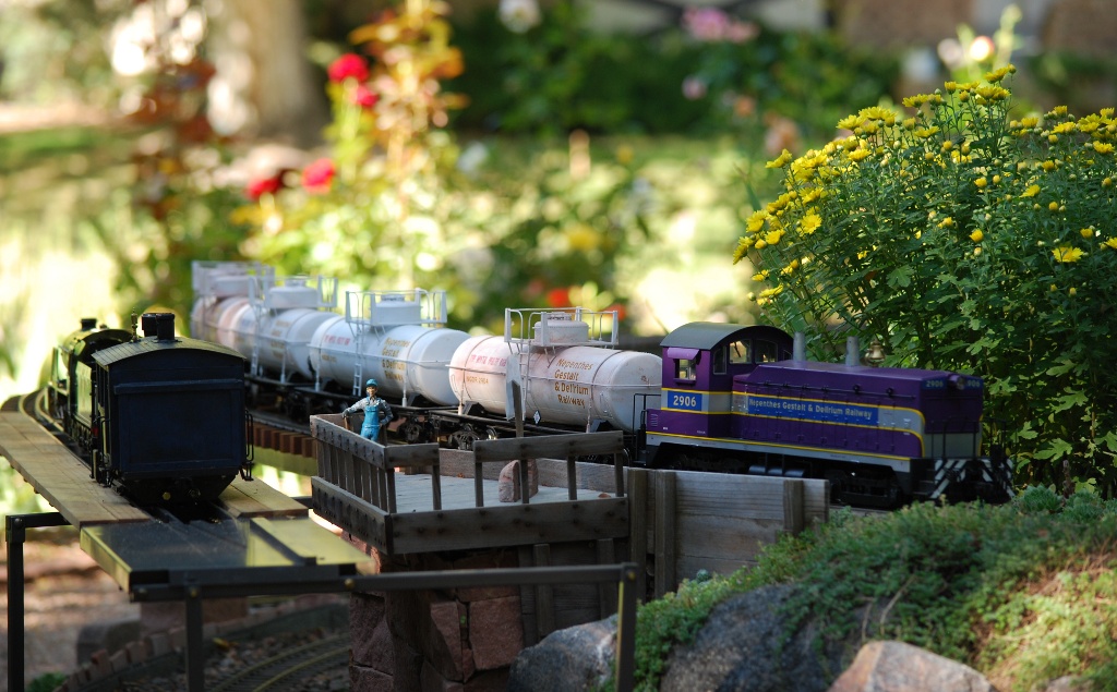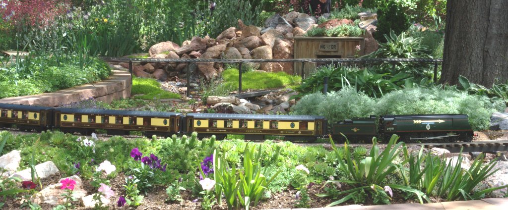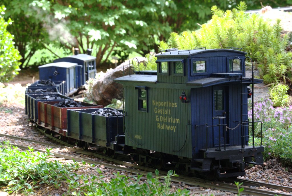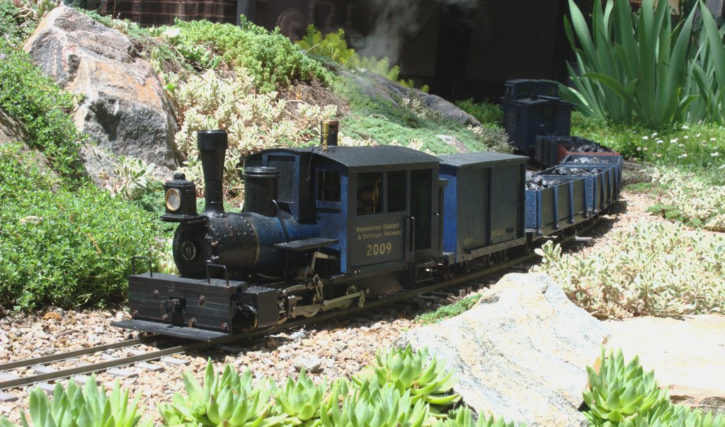 I start off by making these points to make clear that my emphasis is on the railway itself: the NG&DR is my garden railway, not a model of something else. So, I like the "free" in freelance, because then I am able to do things such as run trains in different scales and gauges; and run trains that are made up of carnival floats (for kids, and other non-railway people), in addition to models of past steam-age legends. |