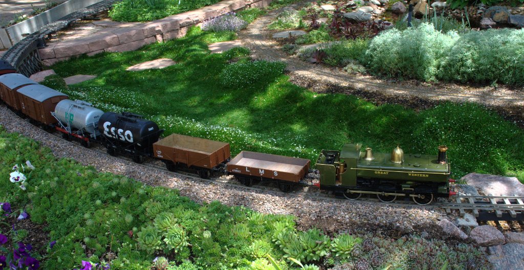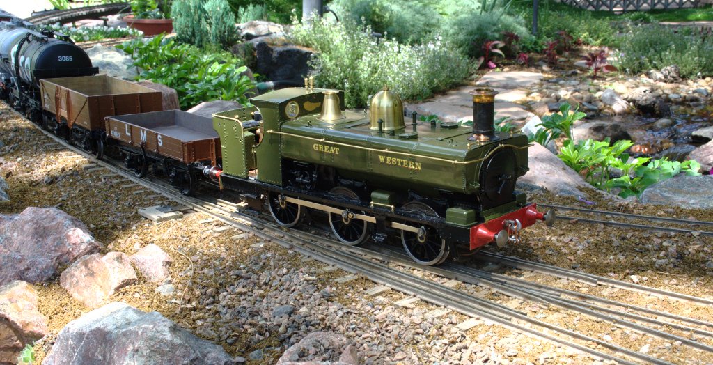 Go Back to the Top I have just one gauge 3 train; for the most part, I have been too busy with gauge 1 and the NG&DR to spend time on gauge 3. The train I have is all from Garden Railway Specialists (GRS). The locomotive is a live steam model of a Great Western Railway 0-6-0 tank locomotive. This locomotive is a GRS-modified electric motor powered kit; unfortunately, it shows it, this is not a well-balanced steam locomotive. I have carried out a significant amount of work on this locomotive, which is described in ReBuilding a GRS Live Steam Pannier Tank. One problem remains, which is that the butane burner howls unpleasantly. Another task remains, which is to fit radio control. The train is a typical British goods (freight) train from years ago when the standard configuration for a goods waggon was two-axles, four wheels, and no braking system when running. Train braking was left to the brakes on the locomotive, brakes on the guards-van, and skilled operators. I like the size of gauge 3 equipment, which, interestingly, at 22.6 scale, is smaller than Colorado narrow gauge equipment on gauge 1 at 20.3. This is because of both the scale difference, and the size difference of the prototypes.