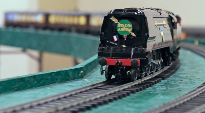 Go Back to the Top The train in image 13 is a model of another train that was part of my growing up. The Golden Arrow, between 1920 and 1960, was the way to travel between Paris and London. In its glory days it was all Pullman, all first-class, and all important. Due to trivial, and lowly, circumstance I saw this train hundreds of times during my childhood and adolescent years. There is a description of this train in Trains Special to Me. Unfortunately, I have been unable to get the model to run successfully on the NG&DR. The final blow to my attempts came when I found that the locomotive, which needs a fairly large radius curve, just would not negotiate a junction of the NG&DR because of a seven-feet radius in conjunction with a gradient change. The train runs well enough on large tracks; at the Sacramento Summer SteamUp, for example, shown in the other image.