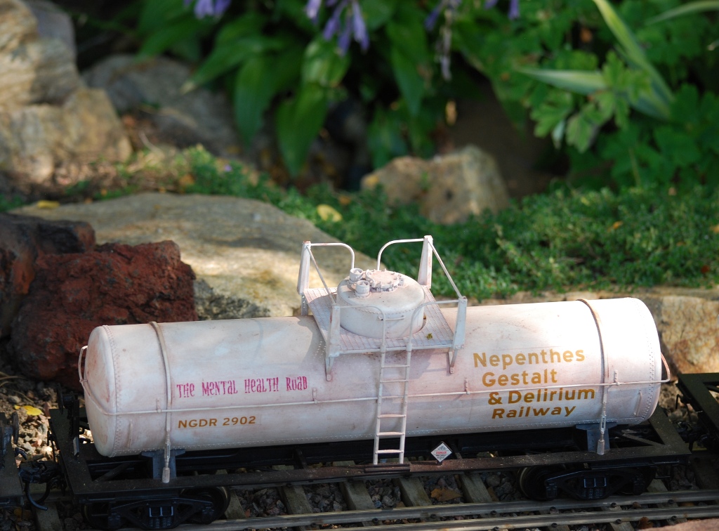 However, the description of Nepenthes that I like is that it is A drug that dispels the cares of the world. And I think that sounds pretty good. If my Railway becomes someone's Nepenthes then I shall be well pleased. Gestalt is A whole that is greater than the sum of the parts and comes from the Uber Gestaltqualitaten of Christian von Ehrenfels. Briefly, my Gestalt is the spirit-lifting feeling that can come from a miniature train threading its way through the flowers. Delirium is the effect of the Nepenthes and the Gestalt, and is admittedly heavy-duty: temporary and reversible severe confusion and rapid changes in brain function. But, if one ignores the technical gibberish and segues into delirious, the concept becomes rather inviting: thrilled, excited, ecstatic. If my railway gets me thrilled, excited, or ecstatic, simply by arranging a miniature train to