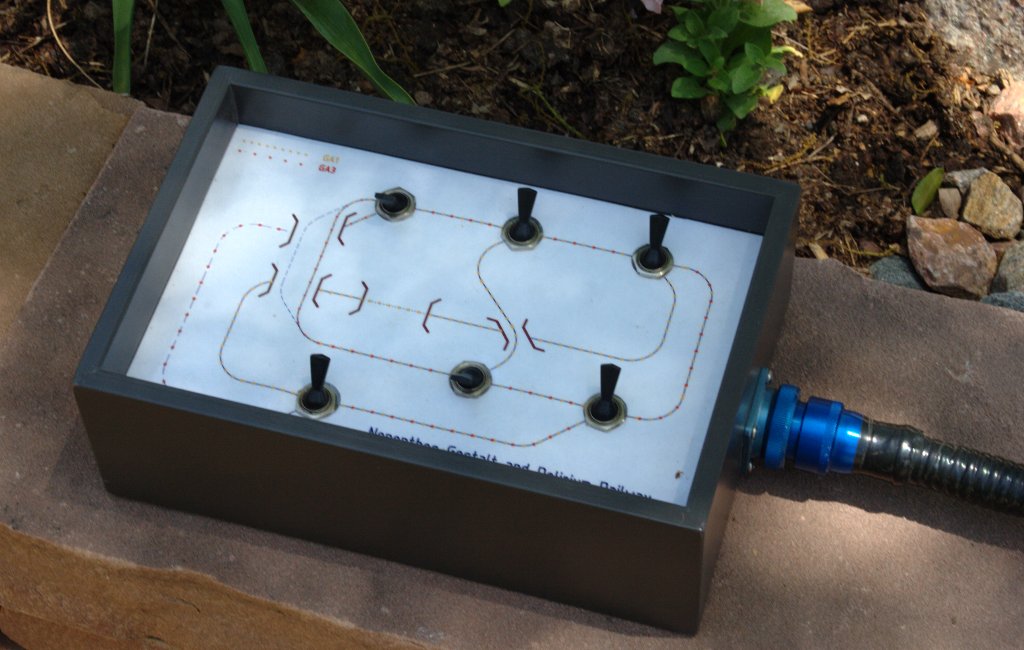 Operation Go Back to the Top There are three main ways to operate the railway. The simple mode is to run a train, in either direction, around the continuous oval. This mode is available by switching the points appropriately; but, also, is the default setting when the air supply is not connected. This mode is very convenient at times; and often is used by steam-up visitors who have no interest in railway operation, and are content with just seeing their engine chug along a track. But I find the continuous oval to be too much like a track around a Christmas tree with a train chasing its tail. I like to see trains running down different tracks and demonstrating the effect of the reversing loops. I have to admit to getting a bit of a charge from a visitor suddenly getting animated and saying "Oh, its going the other way!" (it's that Gestalt again). And visitors, particularly kids, certainly like to see trains switched onto the track going across the stream and through the tunnel. Also, using this simple mode means that reversing travel direction has to be effected by a human "crane-shunt". Thus, using just the continuous oval is the convenient and simple, but boring, mode. A second mode of operation is to route a train by switching points according to one's fancy. Now the problem with that mode of operation is that it is surprisingly easy to derail a train with badly set trailing points. Almost always, when this happens, it is because someone spoke to the operator, distracting him from his job. The other times occur when the operator distracts himself. Ideally, trailing points are forgiving and allow themselves to be pushed out of the way; but this does not always happen if the rolling stock is lightweight, and cannot happen if the junction is dual-gauge and has a secondary point. The third operation mode is a variation of the second: disciplined instead of casual point switching. It sounds terrible, but it is not in practice. Once a train has entered a reversing loop, in order for the train to exit in the normal way, the junction points must be switched. This is very obvious when actually thinking about a canonical reversing loop; but, as indicated above, experience on the NG&DR is that, with casual point switching, humans forget and get it wrong - leading to a derailment. However, a rigorously applied single rule that the points always are switched once the train is through, works very nicely, leading to a train using all the available reversing loop track, in both directions, without much thought and without derailment. Some emphasis on the usefulness of this discipline can occur when, for some reason, normal operation is changed and the train is reversed to exit the loop. In this case, the just-switched points are wrongly set, which is easily forgotten, and derailment-in-reverse occurs. On the NG&DR, a benefit of using the reversing loop track exclusively, as occurs using the third operation mode, is that a second train can be parked on the cut-off track, i.e., in the station, at the same time as the first train is running. The points on the junctions protecting access to the station track never are switched in the third operation mode. |