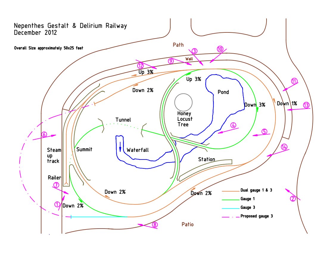 Trackplan, the Railway in the Garden Go Back to the Top The semi-formal garden layout, with its walls, patio, and sloping terrain dictated rather a lot of the track design. Also, there was the strong desire to enhance, not fight with, the garden. Although I knew little about model railway layout design, I did understand the concept of a direction-reversing track; I knew that I wanted live steam; and gauge 3; and fun-operation; and a whole lot of things, some eventually realized, some not.