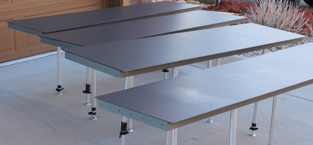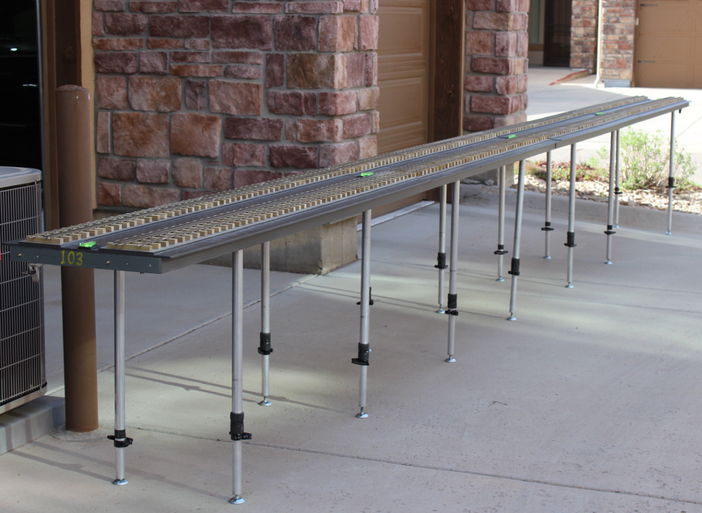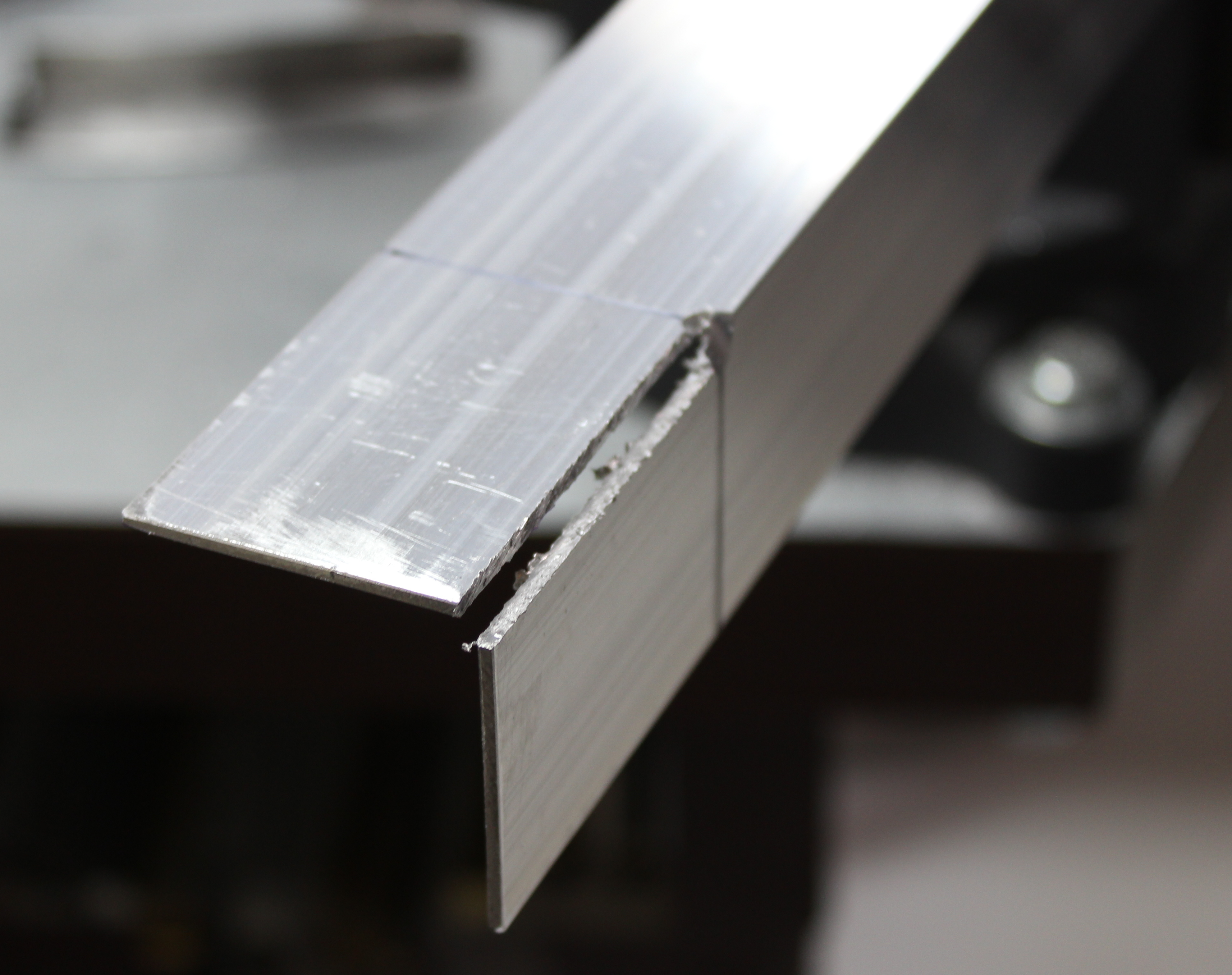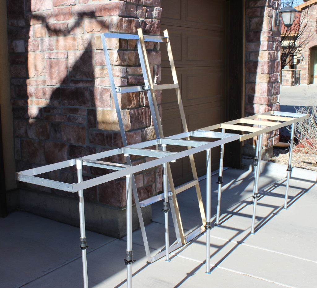 The all-weather modules do not use wood. The ladder cross members are aluminium angle with ends bent as shown in the images. The leg sockets are PVC pipe fittings, instead of metal tubing, because there was none of the latter available in the left-over stock. And the decks are (probably) Dibond, made from re-purposed real estate signs rescued from the trash. One image shows a couple of holes from this previous life. |