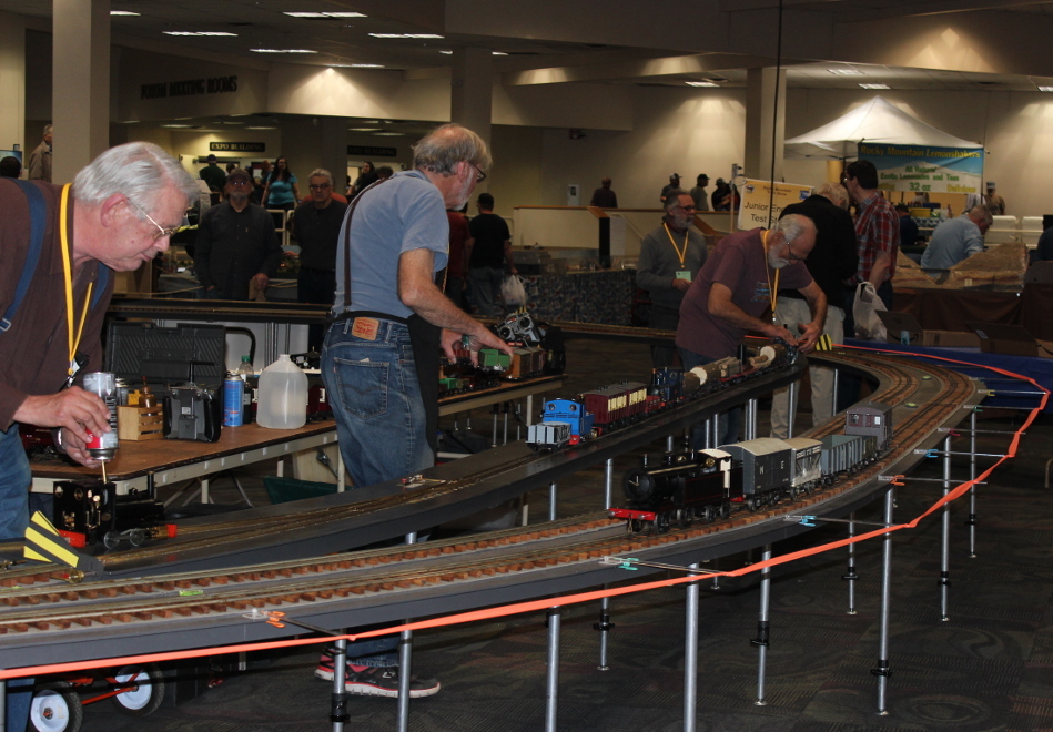 All the existing modules are labelled uniquely and the trackplan shows how they fit together. Arbitrary assembly order is possible, in a similar way as that of a beginner's H0 train set. Thus, there exist ten double track curved modules labelled 201-210; these are used in the places labelled 2nn on the trackplan. Other modules are unique, for example junction 904. Curves 602 and 604 are identical, interchangable, single track curved modules. Both oval tracks are dual gauge, the outer track G3 and G1, the inner G1 and G0. All of the junctions are single track modules. On the trackplan, these junctions each are paired with a single track curved module, e.g., 901 with 601 or 603. Taken as a pair, these two modules have the same interface footprint as a single double track curved module, i.e., a 2nn. Thus, since the junctions have no actual track-switching function in configuration P, their positions in the oval are not critical and can be swapped with those of 2nn modules. For the module availability reason described already, it is necessary to use junction modules in configuration P simply because only ten 2nn modules have been made. Configuration P can be made smaller by omitting the two 1nn straights. The space required envelope then becomes 37 by 31 feet. If operations get busier, then it makes sense for the trackwork to become more complex. These images show the module trackplan for the basic oval with the addition of two steamup sidings, configuration A, and the inner track steamup siding in use at a train show. |