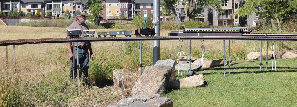Site Go Back to the Top Clearly, the site for a chosen configuration must be sufficiently long and wide. However, consideration also must be given to vertical changes on the site. The floor of a room in a building will be largely flat and level, but may have a dividing step and two levels; an outside site may be sloping or undulating. The portable railway separates the module topside design of railway trackwork from the module underside design of physical support. And this separation provides flexibility that can accomodate significant site vertical variances. Modules have a number of 1-1/8 inch diameter sockets, usually six, as part of their underside physical structure; these sockets are intended to be used to support the module by any practical method. The normal supports for the railway are adjustable telescoping legs that plug into the module sockets. These telescoping legs allow a track height from the ground in the approximate range two feet to three and a half feet. This flexibility allows both choice of nominal railway deck height, and accommodation of site undulations within the range capability.