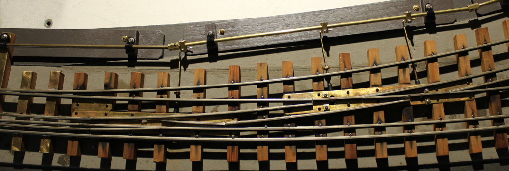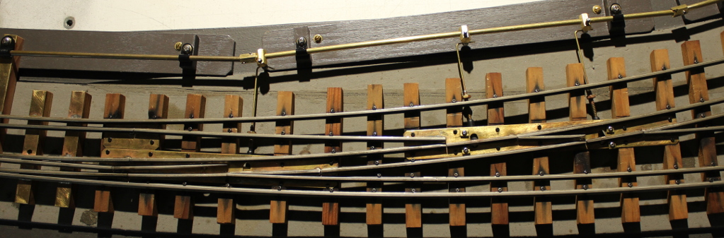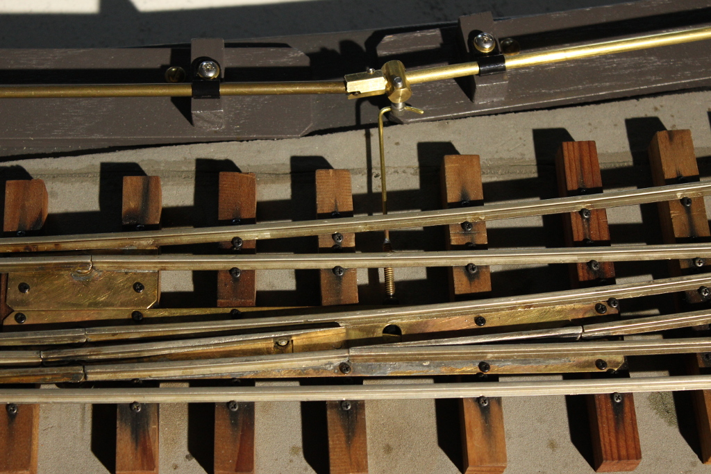 All four Baseline-Plus mainline junctions are made this way; which means that they are quite complex relative to a junction with a simple ground throw next to the main point rails. However, these portable railway junctions are smooth for all trains to run through, and they satisfy my glitch free objective. I note that, since check rails are not necessary, moving point frog junctions are very tolerant of wheels made to standard, fine-scale, or even out-of-spec, dimensions. |