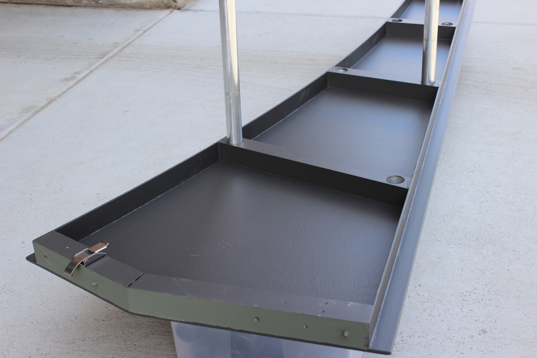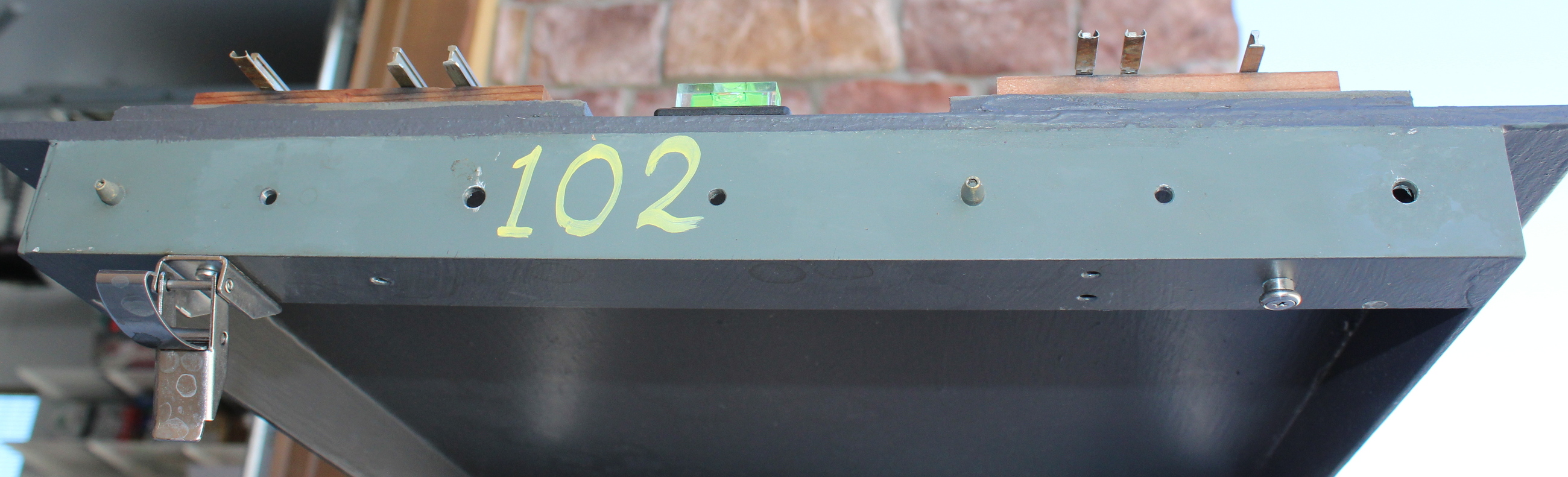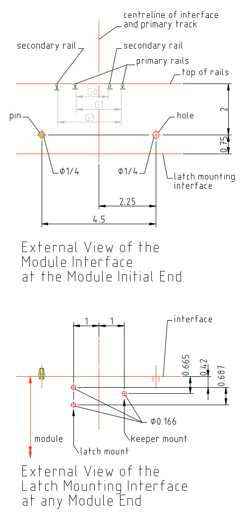 If the secondary gauge rails were not present, then the drawing would be basic. Which means that any two interface instances could be overlaid and the [primary] rails would line up. But, if secondary gauge rails are added to the drawing, as shown, then the rail configuration, being asymmetric about the interface vertical centreline, would result in some rails not lining up. This is because, with secondary tracks shown, the drawing view is of just one end of the module. The view of the other end would have the secondary rails mirrored about the interface centreline. As indicated in the drawing label, the module end shown is referred to as the initial end; the other is the final end. And, when modules A and B are connected, in that order, the final end of A is joined to the initial end of B. The terms initial and final are inherited from the vectors of the abstract design of the modules. The portable railway does not have an interface as shown with four rails. As indicated earlier, the drawing is an amalgam of the two single track interfaces that the railway does have; and each of these has three rails. The two interfaces correspond to two dual gauge tracks: gauges 0 and 1, and gauges 1 and 3. In each case the gauge 1 track is primary, which means that the two interfaces can be joined together, provided that only the gauge 1 track is used. More on the topic of multiple track interfaces follows, after commentary on latching. In contrast to track configuration, latching is basic: all modules have exactly the latching configuration shown at every interface, including junctions or other configurations with more than two interfaces. Thus any two interfaces can be latched together, provided that the module baseboard, or something else, does not prevent it. All interfaces have provision for a pin and latch on the left of the centreline when viewed from underneath, a hole and a keeper on the right. Basic latching reflects the initial assumption of interface unfettered generality referred to in the introductory remarks of this description. The bottom drawing shows a bolt hole interface to a latching mechanism. This latching mechanism could be drawn, in abstract and generalized form, so that any conforming latch and keeper could be accomodated. This is too hard, I have no intention of getting into designing and producing over-centre latches. In practice, a commercial latch is selected and purchased, with consequent pros and cons. The portable railway selections are Southco stainless steel latch 97-50-110-22, and keeper (the part to which the latch attaches) 97-57-105-24. These are a little expensive at $10-15, according to quantity purchased, for one latch and one keeper; however, they are of good quality and work well.