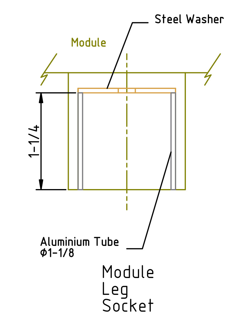 The module leg interface is an aluminium tube 1-1/8 inches internal diameter with a steel washer embedded as shown in the drawing. The washer spreads any point loads within the module. The depth of this socket is not critical. Most modules have six leg sockets; in practice, two, three, or four of these are used to support the railway. As a practical matter it has been found to be highly desirable to prevent legs falling out of the module sockets. To do this, the existing legs have been fitted with magnets that attach to the steel washer at the bottom of a socket. |
