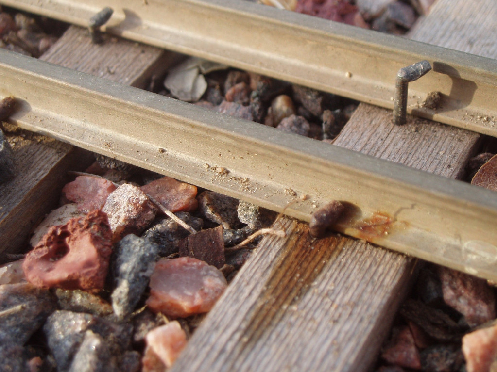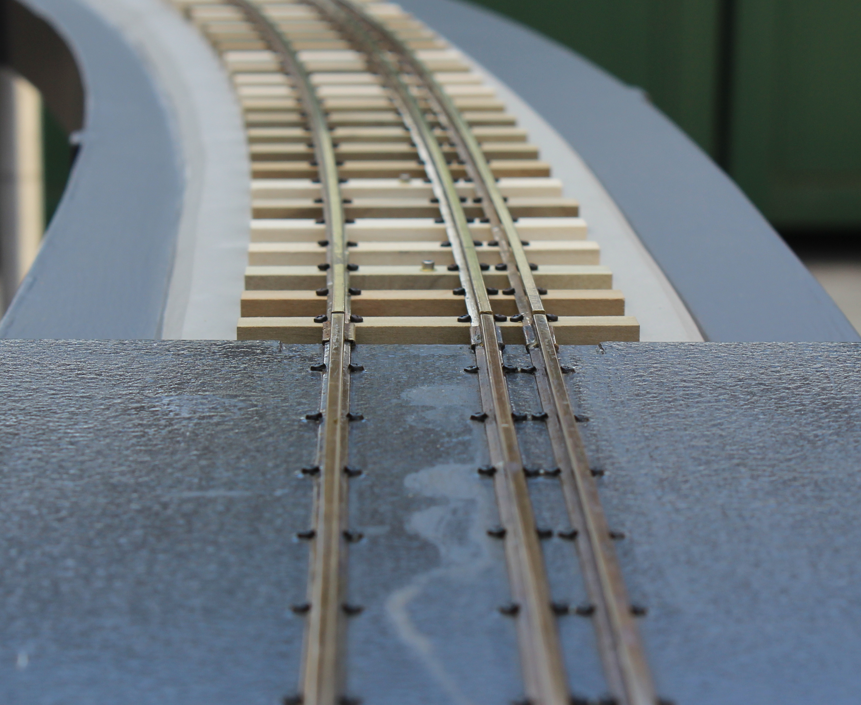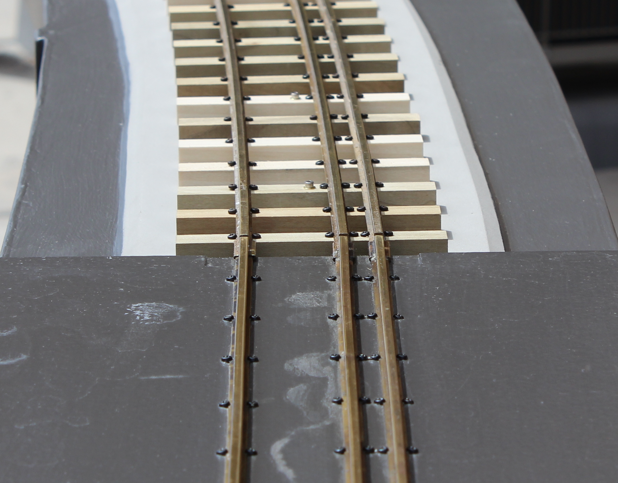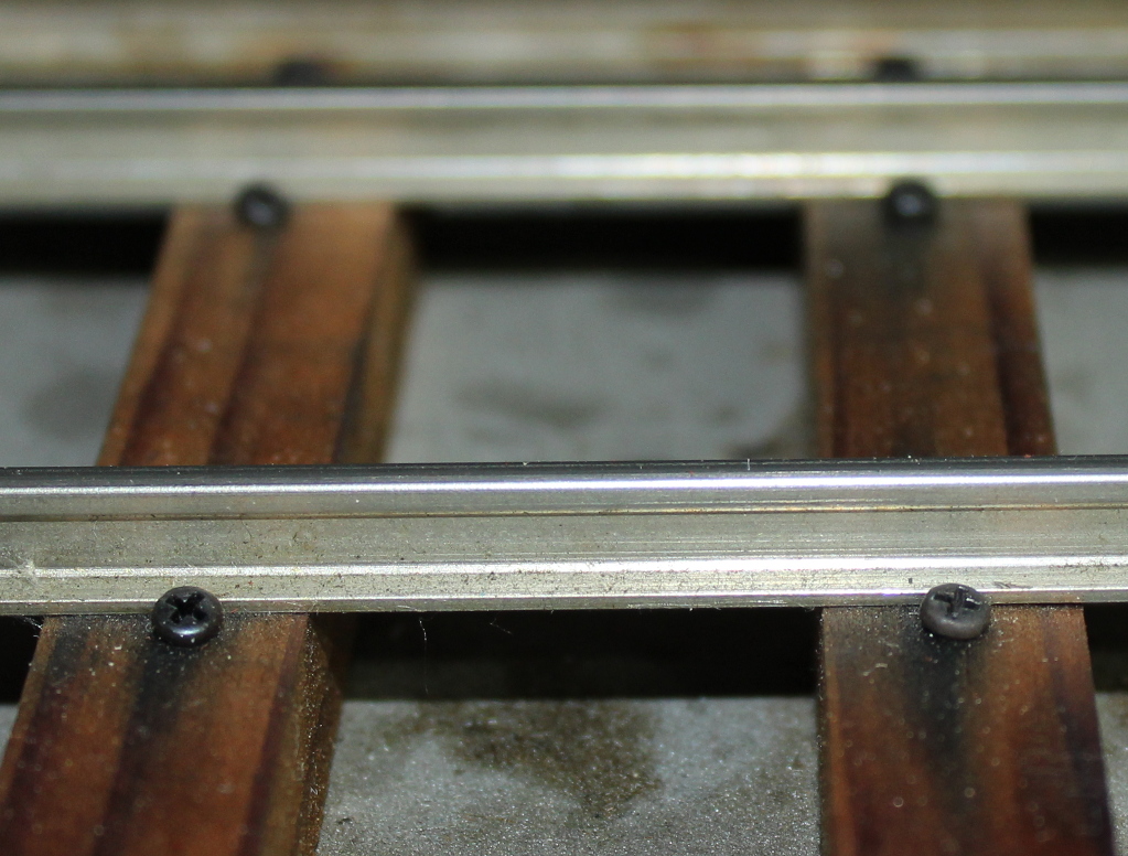 Hand Laid Track, Spikes and Screws Go Back to the Top As can be seen in various images in the Overview (here is one), the tracks on the railway mainline modules are hand laid with rail screwed to redwood sleepers (I have become really good at using a small screwdriver). The explanation for hand laid track is twofold: my possession of a significant quantity of rail, as mentioned as a design constraint; and, secondly, I do not know of commercially available dual G1/G3 track.